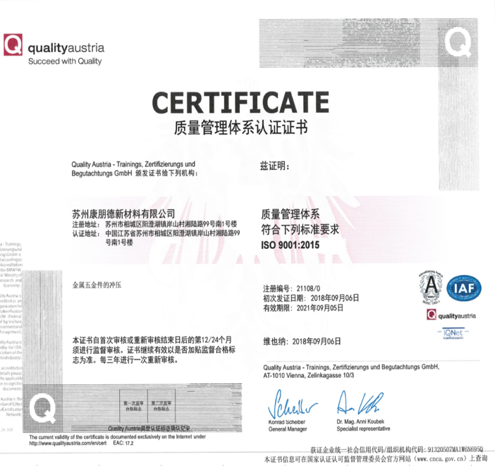 為了更好的使產品質量得到控制,使顧客更加滿意,內部管理水平得以提升,降低企業的管理成本并提高公司的工作效率,蘇州康朋德大力在內部推行ISO體系,讓公司管理更加系統和規(guī)范。并于2018年9月6日取得了認證。